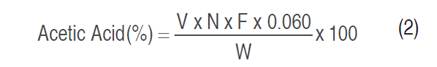 Where V is the volume of NaOH used in titration (mL), N is the normality of NaOH, F is the NaOH factor, W is the weight of the sauce sample (g), and 0.060 is the Milliequivalents of acetic acid.