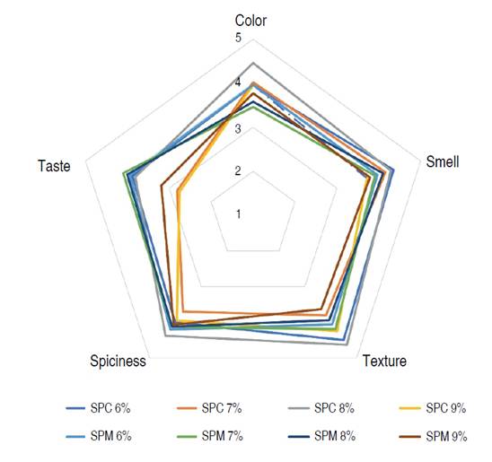 The attributes color, smell, and texture (consistency), and the spicy sensation, presented ratings higher than "3"; while in the flavor attribute, two of the treatments obtained ratings lower than "3" (Figure 1). The highest flavor scores were obtained by SMS 7% TF and SMS 8% TF (Table 3).