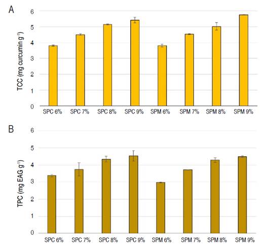 Turmeric from the Peruvian Amazon is a valuable resource characterized by its high content of bioactive compounds, mainly curcuminoids. There was a significant effect (directly proportional) of the addition of TF (P=0) on the TCC content of the SFS (Table 6), since as the percentage (%) of flour in the SFS increased, the TCC content increased (Figure 2). The TCC content of this study was in the range of 3.8 to 5.74 mg g-1 sample.
