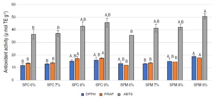 The antioxidant capacity of SFS was determined using the procedure described by Barriga-Sánchez et al. (2021), using the reagent 2, 2-diphenyl-1-picrylhydrazyl (DPPH). For the calibration curve, Trolox was used as a standard, and a calibration curve was prepared from the sample extracts, from 100 µL to 900 µL. After 30 minutes of reaction in the dark, the absorbance was determined in the spectrophotometer at 518 nm. The results were expressed in µmol TE g-1 SFS.