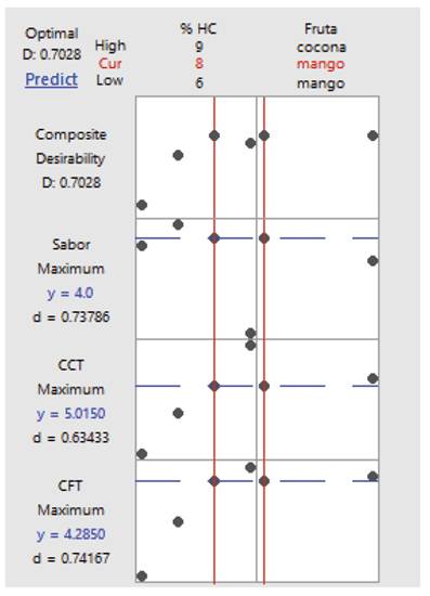 The predicted formulation obtained with the full factorial design, maximizing flavor, TCC, and TPC, was SMS 8% TF (Figure 4); the highest desirability was for flavor and TPC, and the desirability when evaluating TCC was lower.