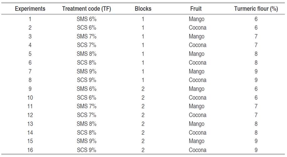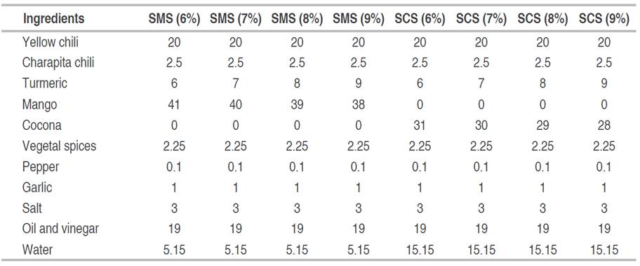 To formulate the SFSs, a full factorial design was used with the Minitab statistical program (Table 1), with two factors: Type of fruit with two levels: mango and cocona; and the second factor: turmeric flour content with four levels: 6, 7, 8, and 9% turmeric flour. TF was added to the spicy mango (SMS) and cocona (SCS) sauce as established in Table 1.