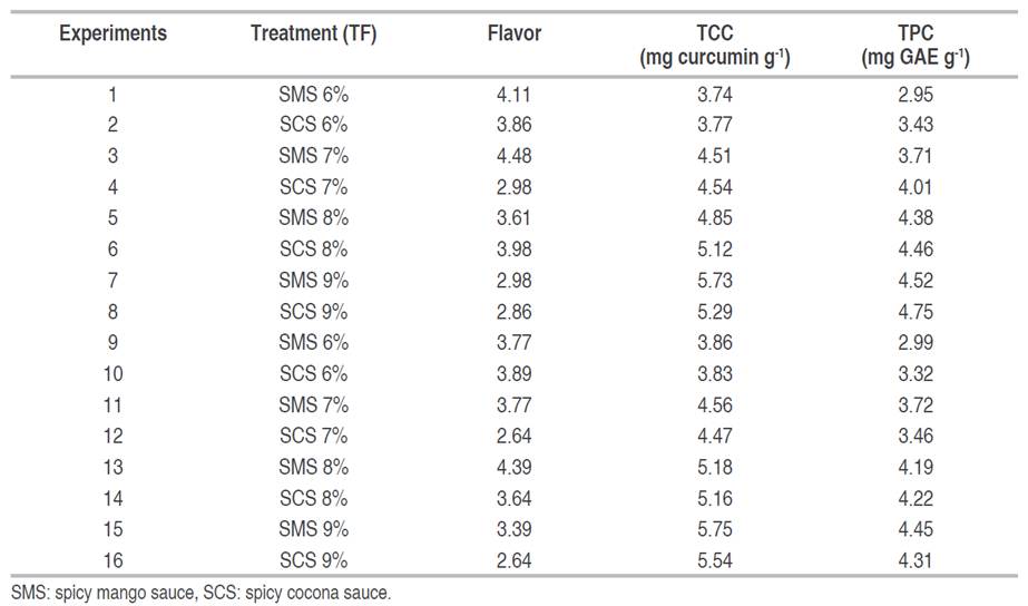 Table 3 Experimental design with results of flavor rating, total curcuminoids (TCC), total phenolic compounds (TPC) of mango (SMS) or cocona (SCS) spicy sauce with 6, 7, 8 and 9% turmeric flour.