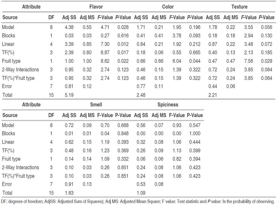 Table 4 ANOVA of the factorial design of the attributes flavor, color, texture, smell, and spiciness of the Spicy Fruit Sauce.