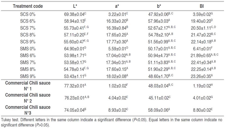 The average values of L* of the SCS were in the range of 55.60 to 58.94, and for the mango, from 53.43 to 54.78; and the a* value of the SCS presented lower values than the SMS, indicating that the cocona hot sauce presented greater clarity than the mango hot sauce. The b* value of the SCS 6% TF presented a greater yellow intensity than the rest of the SFSs. No articles on sauces of this type were found in the bibliography consulted. The color coordinates L* and a* presented values very far from those of commercial hot sauces (Table 5), possibly due to the use of turmeric, which is a natural colorant. The commercial sauces used in the comparison with the sauce in this work do not contain fruit or turmeric but represent the varieties of spicy sauces available in supermarkets in Lima, Peru.