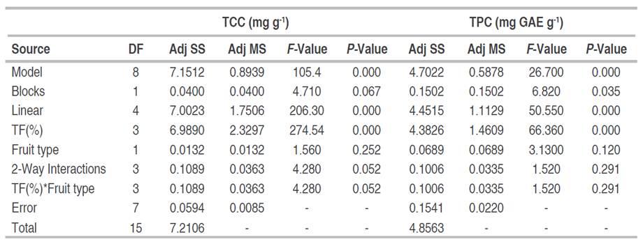Table 6 Analysis of variance of factorial regression of total curcuminoids (TCC) and total phenolic compounds (TPC) vs % turmeric flour and type of fruit.