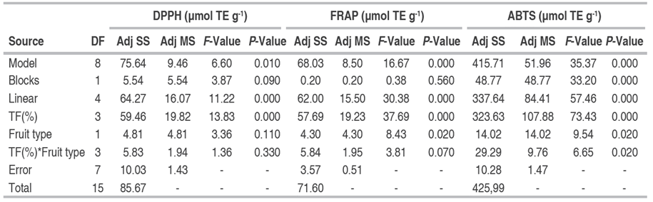 The percentage (%) of TF in the SFS formulation had a significant effect on the antioxidant capacity value DPPH (P=0.000), FRAP (P=0.000), and ABTS (P=0.000). As well as the type of fruit (P<0.05) on the antioxidant capacity, FRAP, and ABTS (Table 7). No studies reporting the antioxidant capacity of spicy fruit sauces with turmeric or similar formulations were found in the literature review. The following section discusses studies on antioxidant activity in other sauces. Guo et al. (2024) reported the antioxidant capacity (FRAP) of 360 µmol TE L-1 of a fermented spicy Chinese cabbage sauce, a value higher than that reported in this study, possibly due to the different technique and inputs used in its process.