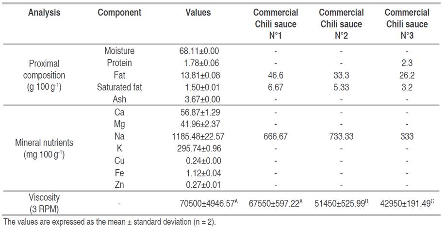 Commercial sauces 1 and 2 exhibited higher fat and saturated fatty acids content in comparison to the sauce developed in this study.