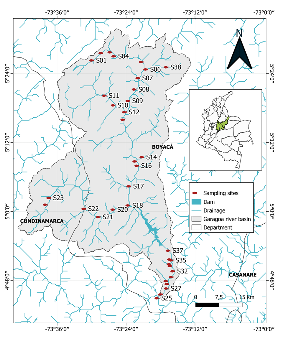 The Orinoco River macrobasin has an extension of 981,446 km2, 35% of which is part of the Colombian territory (Bustamante, 2019). In Colombia, the Orinoco macrobasin is made up of eight sub-basins: Orinoco, Inírida, Guaviare, Vichada, Tomo, Meta, Casanare and Arauca rivers, and 95 sub-basins (IDEAM, 2004), where 767 native fish species have been recorded (DoNascimiento et al., 2024). Some of these tributaries originate in the Eastern Cordillera of the Andes, including the Meta River, which receives several tributaries from the eastern flank of the Eastern Cordillera, such as the Cravo Sur, Guanapalo, Ariporo, Pauto, Casanare, Guachiría, Cusiana and Upía rivers (Cala-Cala, 2019). The latter is formed by the Guavio, Lengupá and Garagoa rivers, where 103 fish species have been recorded, represented in 20 families and 53 genera (Urbano-Bonilla et al., 2021). Specifically in the Garagoa river basin, 32 species have been recorded (Urbano-Bonilla et al., 2021). However, this information comes from the lower part of the basin, with the headwaters and smaller streams little studied, making part of their taxonomic richness still unknown, a pattern common to the headwater rivers of the Orinoco river basin (Cala-Cala, 2019).