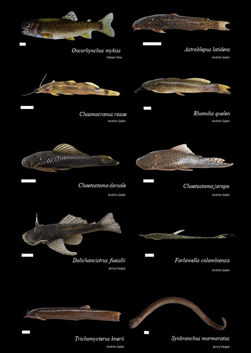Figure 2 Fish of the orders Salmoniformes, Siluriformes and Synbranchyformes from the Garagoa river basin. Scale bars = 1 cm.