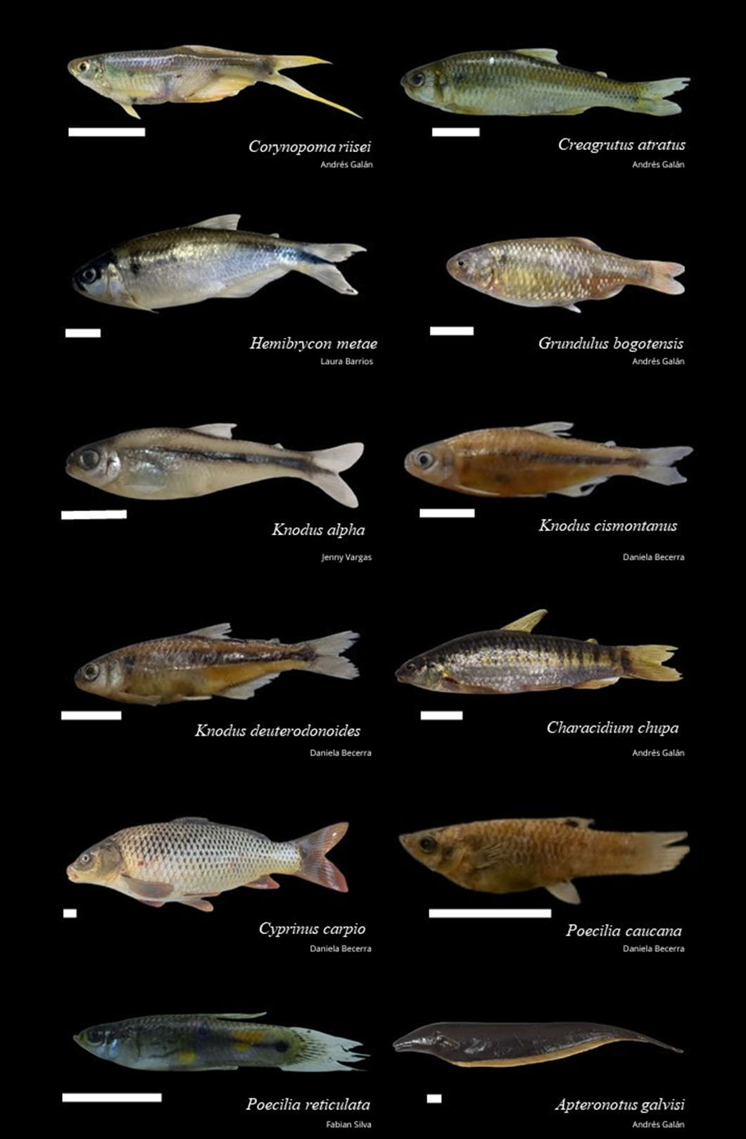 Figure 3 Fish of the orders Characiformes, Cypriniformes, Cyprinodontiformes and Gymnotiformes of the Garagoa river basin. Scale bars = 1 cm.