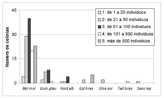 Se efectuó una estimación mediante el conteo directo de los individuos para determinar el tamaño de las colonias. Esto se define como el valor máximo observado en la fecha (capturas o conteo). Para la categorización se determinaron cinco rangos numéricos según la cantidad de individuos: 1 (entre 1 y 20), 2 (entre 21 y 50), 3 (entre 51 y 100), 4 (entre 101 y 500) y 5 (más de 500 individuos).