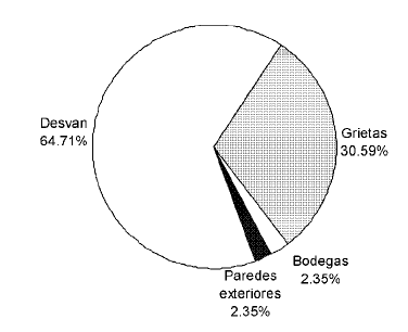 Los murciélagos caseros utilizan diversos tipos de refugios de origen humano: desvanes (64.71%), grietas (30.59%), aleros o paredes exteriores (2.55%) y el interior de grandes construcciones como aeropuertos, bodegas, teatros, torres de iglesias y otros (2.55%) (Figura 3). La disponibilidad de refugios es una de las limitantes para la presencia de murciélagos (Lewis 1995), siendo las cavidades naturales sitios idóneos para refugio. Sin embargo, este tipo de espacios son poco frecuentes en ciudades donde las edificaciones brindan una amplia gama de alternativas para las especies, cumpliendo con los requisitos mínimos para albergar colonias de murciélagos caseros.