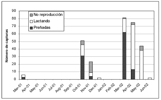 Figura 5. Condición reproductiva de las hembras adultas de N. albiventris entre marzo de 2001 y junio de 2002 (N= 284).