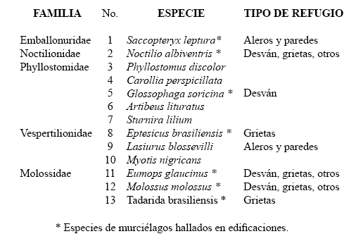 En el sentido de edificaciones-refugio, los murciélagos aprovechan las variadas posibilidades que ofrece la infraestructura de la ciudad. El único embalonúrido registrado, Saccopteryx leptura (Schreber, 1774), fue encontrado sobre muros exteriores de edificios, de casas de madera y en medio de hojas secas de palma de cabañas; estos murciélagospueden estar reemplazando las superficies de cortezas de árboles por estos sitios. Así pues, superficies de paredes con terminados rústicos y rugosos pueden indirectamente estar beneficiando a esta especie.