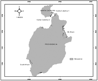 El presente estudio se llevó a cabo entre los meses de septiembre y noviembre de 2007, en los sectores de McBean, South West y Santa Catalina (Figura 1); el sector de McBean se encuentra en el Parque Nacional Natural Old Providence y Mc Bean Lagoon, el cual comprende un área de 995 ha, y presenta un bosque de manglar de 30 ha de extensión con dos lagunas internas salinas. La especie de manglar predominante es R. mangle con un 53 %, seguida por A. germinans con 46 % y L. racemosa con 1 %. En Bahía South West, el segundo manglar más grande en extensión después de McBean con 3.6 ha (Minambiente 1996) y la especie dominante es L. racemosa con 65%, seguida por R. mangle con 35% (Taylor & Skinner 1993), encontrándose únicamente un pequeño parche de A. germinans compuesto por cinco árboles. El humedal de Santa Catalina, se caracteriza por presentar parches aislados de R. mangle, además de A. germinans y L. racemosa, la especie dominante es A. germinans (56%) seguida por R. mangle (39%) y L. racemosa (7%).