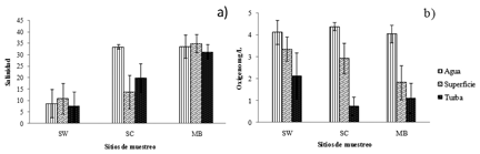 La concentración de oxígeno disuelto en la capa de agua que cubre los suelos de manglar, no muestra diferencias en las aguas adyacentes de los manglares (Figura 2b), igualmente para el sustrato turba, donde South West presenta el valor más alto, seguido por McBean y Santa Catalina. Por el contrario, en el sustrato superficie de McBean los registros fueron inferiores a South West. El manglar de Santa Catalina no presenta diferencias con los otros dos bosques para este tratamiento.