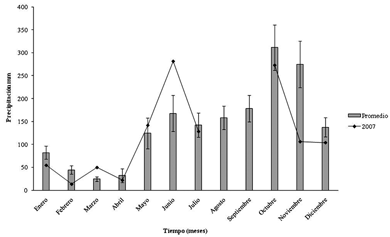 La figura 3 muestra un régimen pluviométrico monomodal, donde la mayor precipitación se da en los últimos meses del año, seguido de un periodo seco los primeros meses hasta junio donde inicia el periodo de lluvias. Durante el 2007 no se observaron muchas diferencias con respecto al registro al histórico, solo en algunos meses como marzo y junio donde la precipitación fue mayor y en noviembre donde fue menor.