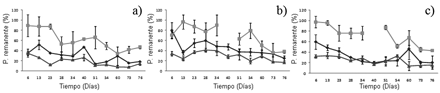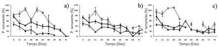 La velocidad de descomposición (g día-1) en cada uno de los sitios y sustratos es más rápida durante las tres primeras semanas (Figura 4, figura 5 y figura 6), donde se presentó la mayor pérdida de biomasa, con valores promedio altos de peso remanente (Tabla 1). Luego se observó un periodo de lenta descomposición hasta el final del periodo de muestreo, donde la biomasa promedio remanente fue menor (Tabla 2).