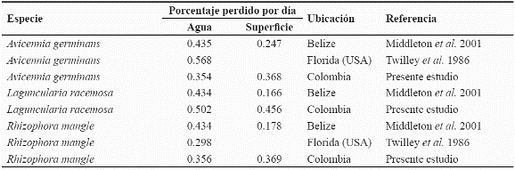 Este humedal se caracteriza por presentar valores bajos de descomposición reflejados en los valores de K (Tabla 3), los cuales se explican en la ubicación del humedal, el cual esta protegido del oleaje por una barrera de arena que se abre temporalmente al mar (Von Prahl 1989). Los tratamientos muestran una tendencia similar (Figura 5a, b y c) para cada una de las tres especies, donde A. germinans se descompone a menor velocidad que las otras dos especies, siendo L. racemosa la más veloz de las tres en el sustrato agua (Tabla 3).