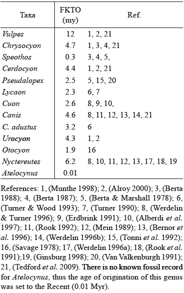 Table 1. First known times of origination for canid genera. FKTO, first known time of origination.