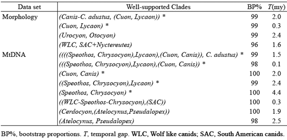 Phylogenetic analyses of separate morphological and mtDNA data sets led to the most parsimonious trees shown in Figure 1A, figure 1B. The topology of these trees is the most stable, not only because they are among the initial set of MPTs derived from the data sets but also because these are the resulting topologies after one cycle of reweighting. Data set incongruence as indicated by bootstrap support of clades led to the identification of the conflicting phylogenetic hypotheses presented in Table 2. This table also presents temporal gaps (T) for all clades (conflicting and non-conflicting) supported by BP>95%. Little or no bootstrap support for conflicting nodes in rival trees was found when tables of bootstrap partitions for each data set were examined. Conflicting clades referred to the hypothesized phylogenetic relationships among the wolf like canids genera and two South American genera Speothos Lund 1839 and Chrysocyon Hamilton-Smith 1839. The sister taxa hypothesis between these last genera (100% BP) was included in the set of conflicting clades since its grouping with Lycaon Brookes 1827 is conflictive. The mtDNA suggest that the Lycaon lineage and the hypothesized ancestor of Speothos and Chrysocyon split from a common ancestor about 4.7 Myr. To test this hypothesis it is necessary to test also the hypothesis that Speothos and Chrysocyon evolved from a common ancestor. In this manner, the internal consistency of the node is tested.