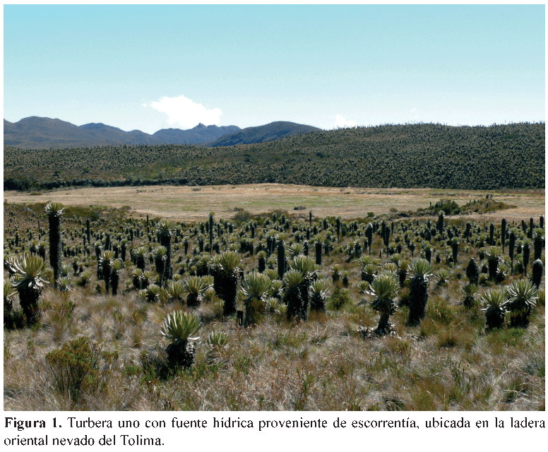 Turbera 1: Ubicada en la ladera oriental del nevado del Tolima (4° 40' 34" Norte y 75° 18' 14" Oeste). Turbera con fuente hídrica proveniente de escorrentía (Figura 1).