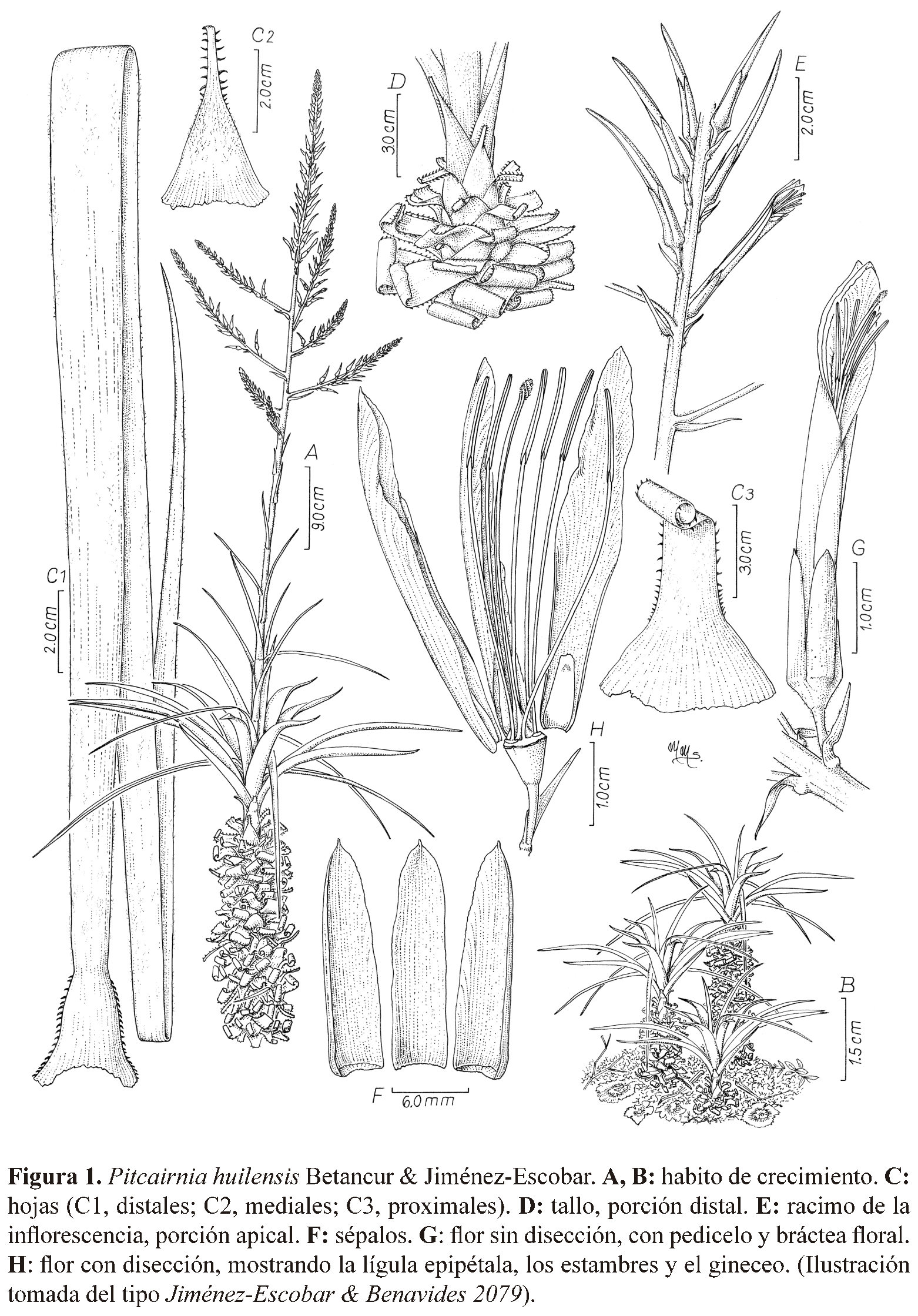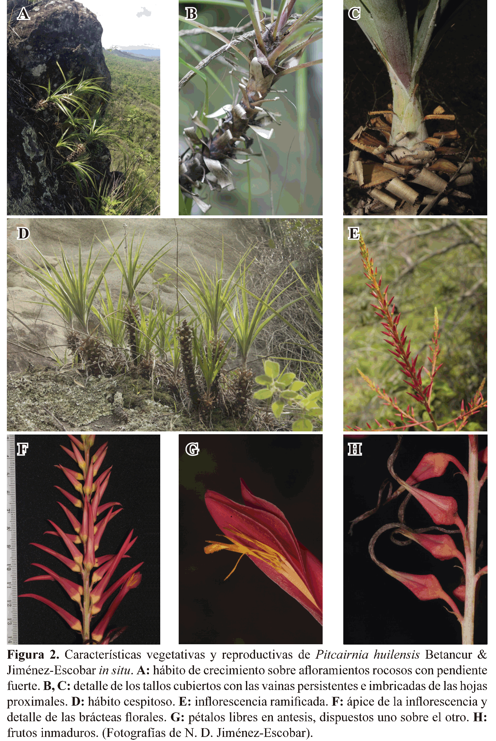 Comentarios taxonómicos. Pitcairnia huilensis pertenece a un grupo de especies dentro de Pitcairnia que son propias de formaciones secas o áridas del neotrópico y que se caracterizan por presentar las láminas de las hojas caducas a través de una línea transversal ubicada por encima de la vaina foliar (Smith & Downs 1974). Por otra parte, dentro de este grupo de especies, hay algunas que presentan tallos alargados, ramificados o no, cubiertos con los remanentes de las hojas (vaina y porción basal de la lámina) y sin pseudopecíolo, además de crecer formando agregaciones más o menos densas. Entre estas especies propias de enclaves interandinos secos de Colombia, Ecuador y Perú, se encuentran P. billbergioides L. B. Sm. (de Ecuador y Perú), P. huilensis (endémica de Colombia), P. lechleri Baker (endémica de Perú) y P. lignosa L. B. Sm. (de Colombia y Ecuador). Aparentemente, estas características son adaptaciones de las plantas a las condiciones extremas de los ambientes en donde crecen, como son altas temperatura y radiación lumínica, así como la generación de incendios naturales durante las épocas secas.
