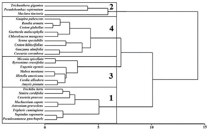 Figura 1 Tipos Funcionales de Plantas (TFPs), dendrograma obtenido mediante análisis jerárquico de conglomerados, usando método de Ward y distancia Euclídea, a partir de las variables (rasgos) área foliar, área foliar específica, contenido foliar de materia seca, densidad de la madera y altura máxima. Los números en las ramas señalan cada tipo funcional de planta.