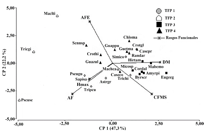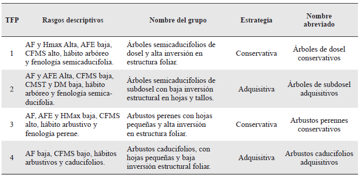 De acuerdo con lo anterior, los cuatro tipos funcionales de plantas se definieron así (Tabla 3): El TFP 1, caracterizado por árboles semicaducifolios de dosel, baja inversión en estructuras fotosintéticas y potenciales bajos valores de crecimiento relativo. El TFP 2 corresponde a árboles semicaducifolios de subdosel con alta inversión en estructuras fotosintéticas y tallos. El TFP 3 fue conformado por arbustos perennes con hojas pequeñas, baja inversión en estructuras fotosintéticas y potenciales bajos valores de crecimiento relativo, el TFP 4 compuesto por arbustos caducifolios, con hojas pequeñas y una alta inversión en estructuras fotosintéticas. En este sentido, los TFPs se agruparon en dos estrategias (Figura 2, Tabla 3): especies adquisitivas, con bajos valores de contenido foliar de materia seca, alta área foliar específica, con tendencia a la caducifolia y densidad de la madera de media a baja (TFPs 2 y 4); y especies conservativas con altos valores de contenido foliar de materia seca, baja área foliar específica y con tendencia a mantener las hojas durante el año (TFP 1 y 3).