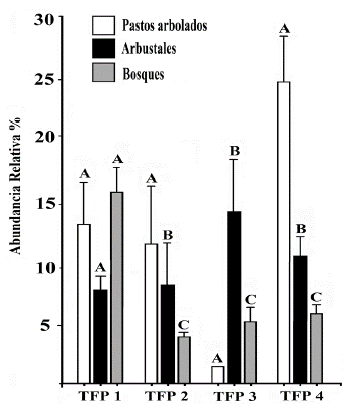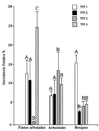 En cada estado sucesional se determinó la dominancia de los TFPs en términos de abundancia y área basal, en los pastos arbolados con dominio de Guazuma ulmifolia el TFPs con mayor abundancia y área basal fue el 4 (arbustos caducifolios adquisitivos, P = 0,01); mientras que el TFP 3 presentó los valores más bajos (Fig. 3). Los arbustales fueron dominados por los TFPs 3 (arbustos perennes conservativos) y 4 (arbustos caducifolios adquisitivos, P = 0,05), los cuales presentaron una abundancia relativa significativamente mayor en este estado sucesional, que los TFPs 1 (árboles de dosel conservativos) y 2 (árboles de subdosel adquisitivos, Fig. 3). En los bosques, el TFP1 fue más abundante (P << 0,01) que los demás TFP, los cuales presentaron una abundancia similar entre sí (Fig. 3). Sin embargo, en términos de área basal relativa, en los bosques se encontró una dominancia estadísticamente mayor (P = 0,01) de los dos TFPs asociados a estrategias conservativas, es decir, árboles de dosel conservativos (TFP 1) y arbustos perennes conservativos (TFP 3), respecto a los dos TFPs asociados a estrategias adquisitivas (2 y 4).