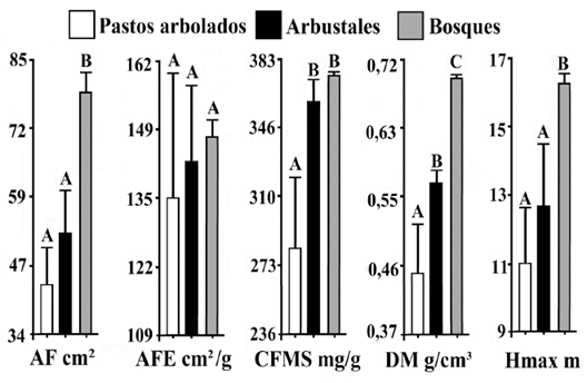 Los arbustos caducifolios adquisitivos (TFP 4) fueron los más abundantes en los pastos arbolados con dominio de G. ulmifolia. Este patrón podría obedecer a una mayor capacidad de adaptación a condiciones que exigen alta eficiencia hídrica, expresada en rasgos que contribuyen a tolerar o evadir la sequía (Aranda et al. 2014), en este caso la presencia de hojas caducifolias (Salgado-Negret y Paz 2016) o a una menor área foliar, lo que contribuye a disminuir la respiración y la pérdida de agua (Kucharik et al. 1998). Por lo tanto, es posible inferir que el principal filtro ambiental que configura la composición de rasgos en la comunidad es la disponibilidad de agua (Ceccon y Hernández 2009), seguido por el tipo de perturbaciones antropogénicas (Foley et al. 2005) debido a que el área de estudio estuvo sometida a una ganadería tradicional extensiva (Avella et al. datos no publ.) en la que era frecuente dejar algunos árboles de G. ulmifolia para favorecer el sombrío y forrajeo del ganado.