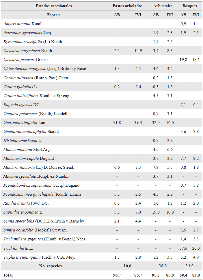 Se seleccionó un total de 41 biotipos en todo el gradiente sucesional (diez en pastos arbolados, 18 en arbustales y trece en bosques), correspondientes a 26 especies, debido a que una misma especie se podía encontrar en diferentes estados sucesionales, así: tres especies se presentaron en los tres estados sucesionales evaluados, ocho en dos estados sucesionales, y 16 en un único estado sucesional (Tabla 2).