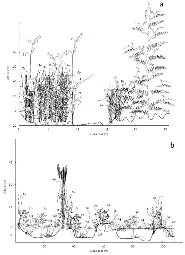 Figura 5 Perfiles fisionómicos mostrando la composición de plantas vasculares presentes en las sabanas estacionalmente inundables de Arauca. Vegetación para zona de bajo evaluada a través de línea de intercepción: a. periodo de sequía; b. periodo de lluvia. Ab = Andropogon bicornis, Ch = Clidemia hirta, Lh = Leersia hexandra, Ms = Melochia spicata, Sa = Senna aculeata, Vb = Vernonanthura brasiliana.