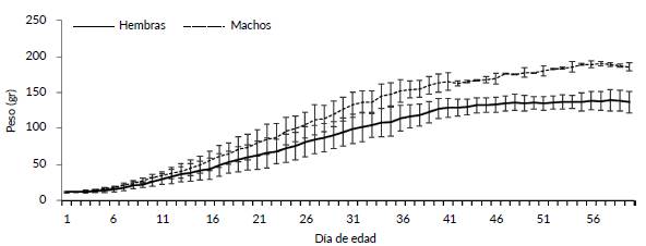 Figura 3 Peso (gr ± DE) de machos y hembras de P. melanops bogotensis criados artificialmente hasta el día 59 de vida.