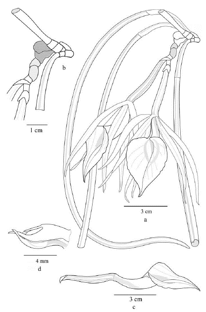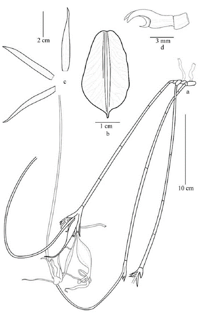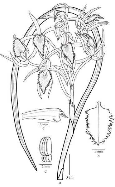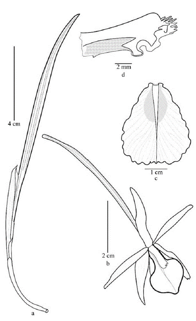 Figura 7 Brassavola fasciculata Pabst. a. Hábito; b. Detalle del labelo; c. Detallle de sépalos y pétalos; d. Vista lateral de la columna, a. basado en ejemplar tipo, b, c y d se redibujó a partir de la ilustración del tipo.