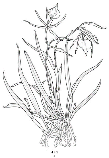 Figura 1 Brassavola acaulis Lind. & Paxton. Redibujado y modificado a partir de la fig. 216 en Paxt. Fl. Gard. 2: 152. 1851. a. Hábito; b. Detalle del nudo donde se origina la flor; c. Flor vista lateral; d. Detalle de la columna.
