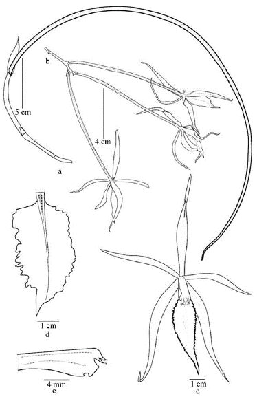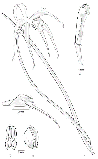 Figura 3 Brassavola angustata Lindl. a. Hábito; b. Detalle de la inflorescencia; c. Vista frontal de la flor; d. Detalle del labelo; e. Vista lateral de la columna. a, b y c basado en el material tipo, d y e basado en Henkel 1845 (NY).