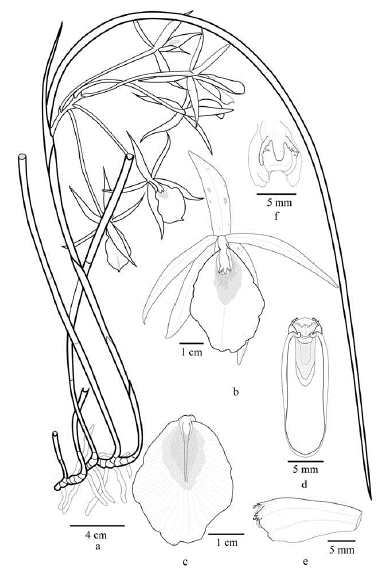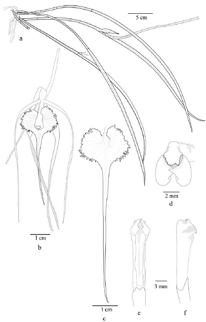 Figura 8 Brassavola fragrans Barb. Rodr. a. Hábito; b. Vista de la flor; c. Detalle del labelo; d. Vista ventral e la columna; e. Vista lateral de la columna; f. vista frontal-superior de la columna. a redibujado de Barbosa Rodrigues sn (1882), b-e basados en el ejemplar Carnevali 7530 (CICY).