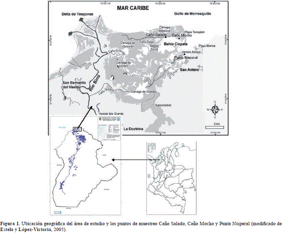 El área de estudio se localizó entre las coordenadas 9° 23' y 9° 25' de latitud norte y 75° 45' y 75° 50' de longitud oeste, e incluyó la zona deltaico-estuarina del río Sinú, cuyo límite al sur es el distrito de riego de La Doctrina, al este, la bahía de Cispatá, al oeste, el río La Balsa, próximo a la población de San Bernardo del Viento, y al norte, el mar Caribe, abarcando la desembocadura y el complejo de ciénagas del antiguo delta ubicado entre la bahía de Cispatá y los caños Grande y Sicará (Figura 1).