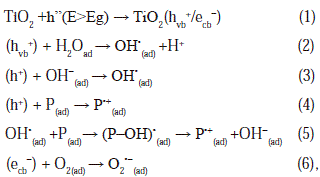 donde CB corresponde a la banda de conducción y VB a la banda de valencia del TiO2, y P es el contaminante (que en este trabajo fue Staphylococcus aureus). En los primeros instantes la radiación electromagnética con mayor energía que la brecha de bandas del TiO2 es absorbida sobre su superficie (ecuación 1) (Macwan, et al., 2011), lo cual genera un electrón en la banda de conducción y un hueco en la banda de valencia; luego, las moléculas de agua adsorbidas sobre la superficie del TiO2 generan radicales hidroxilo (ecuación 2). Los huecos también pueden generar radicales hidroxilo por la reacción directa con iones hidroxilos presentes en la solución (ecuación 3); al mismo tiempo, los electrones en la banda de valencia pueden generar radicales superóxido por la reacción con el oxígeno presente en la solución. Los radicales formados inician el proceso de degradación del contaminante (ecuaciones 5 y 6) (Peláez, et. al., 2012), en tanto que la presencia de oxígeno impide esta recombinación al atrapar electrones a través de la formación de aniones radicales superóxido (ecuación 6). La oxidación (ecuación 4) se ve favorecida por las moléculas que se absorben fácilmente en la fotocatálisis. Por otro lado, los radicales OH · (ad) son capaces de reaccionar en la interfaz o difundirse lejos de la partícula de TiO2 (ecuación 5) con moléculas orgánicas en solución (Zhang, et al. 2013; Chorianopoulos, et al., 2011).