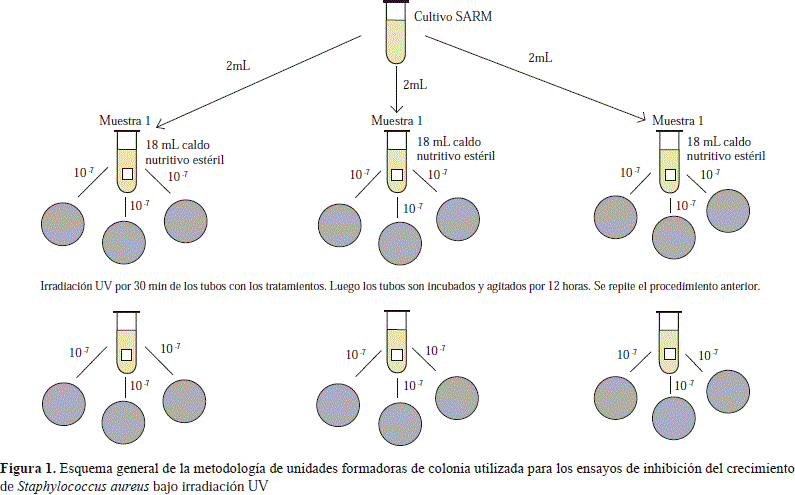 Para el ensayo preliminar de la actividad antimicrobiana de los materiales se empleó la metodología de unidades formadoras de colonia (UFC) (Shrivastava, et al., 2007). Para ello se inocularon las cepas de SARM en 30 ml de caldo nutritivo estéril, y se dejaron en incubación y agitación durante más de 12 horas. Los cultivos de SARM se prepararon en tubos Falcon con una absorbancia conocida (0,05). Se introdujo en cada tubo un tratamiento, es decir, una película del respectivo material, lo cual se hizo por triplicado para cada tratamiento. Además, se usó gentamicina como control positivo y se dejó crecer un cultivo sin ningón tratamiento como control negativo. Se hizo una dilución de 10-7 y se usó la técnica de cuenta en placa. Luego se sometieron los tubos Falcon a irradiación UV durante 30 min con una lámpara de 360 nm de longitud de onda máxima. Los tubos se sometieron a incubación y agitación durante 12 horas y nuevamente se hizo la dilución y el conteo en placa. Por óltimo, se hizo un conteo electrónico de las UFC encontradas en las placas. En la Figura 1 se muestra el esquema general de la metodología aquí descrita.