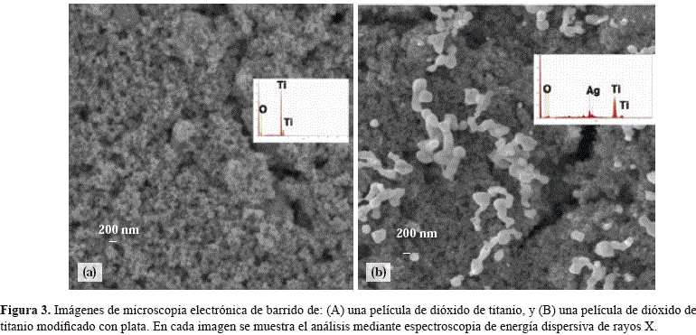 El estudio de la morfología y la composición química de los materiales obtenidos en esta investigación se hizo mediante microscopia electrónica de barrido y EDS. La Figura 3a muestra la imagen de microscopia electrónica de barrido de las películas de TiO2 y TiO2-Ag. La Figura 3a muestra que las películas de TiO2 estaban conformadas por microagregados con un estrecho margen de tamaño del orden de los 50 nm; se observó la morfología típica del TiO2 Degussa P25. Mediante el análisis por EDS se verificó la composición del material utilizado para la obtención de las películas. Las imágenes obtenidas evidencian baja uniformidad superficial en las películas (Clavijo, 2013).