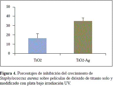 Con el ánimo de verificar la posible aplicación de los materiales obtenidos, se hizo un ensayo de la actividad antimicrobiana contra SARM bajo irradiación UV. En la Figura 4 se muestra el porcentaje de inhibición de las películas de TiO2 y de TiO2-Ag. Se pudo observar que las películas de TiO2-Ag presentaron un mayor porcentaje de inhibición (35 %) que las películas de TiO2 sin modificar (16 %). Este resultado puede atribuirse a dos fenómenos: (a) los agregados de plata depositados sobre la superficie pueden acumular carga y aceptar electrones fotogenerados al interior del semiconductor, la acumulación de electrones puede disminuir la recombinación de portadores y favorecer su transferencia a otras especies para la generación de especies reactivas de oxígeno ó; (b) un aumento en la generación de portadores de carga, ya sea por influencia del campo magnético inducido por el metal incorporado o por el calentamiento térmico ocasionado por la transferencia de carga desde el material adsorbido (Zielinska-Jurek, et al., 2015; Stroyuk, et al., 2010). La segunda de estas hipótesis cobra fuerza debido a los resultados obtenidos en la caracterización por Raman y por SEM; el efecto de incremento superficial de la espectroscopia Raman y la presencia de agregados del orden de los 200 nm sugieren que esta podría ser una de las razones del incremento de la actividad antimicrobiana.