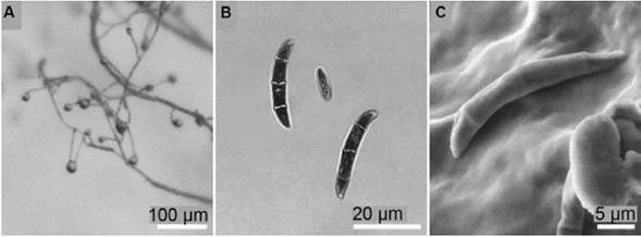Figure 1 Morphological features of F. solani MViRi01 isolate on CLA. (A) Monophialides with microconidia in situ. (B) Macroconidia and microconidium. (C) Scanning electron microscopy of a macroconidium.