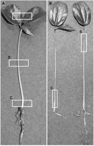 Figure 2 Observed areas in P. edulis f. flavicarpa seedlings. (A) Examination sites on the surface of the seedling: c, collar; s, stem; l, leaves. (B) Examination sites of longitudinal sections of the seedling: c, collar; s, stem.
