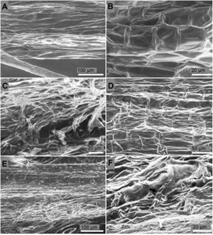 Figure 3 Surface of the collar of P. edulis f. flavicarpa seedlings. (A, B) Surface of the collar of non-inoculated seedling. (C) Septate hyphae colonization over the surface of the collar 24 h after inoculation. (D) Cell wall degradation and loss of turgor pressure of the epidermal cells of the collar four days after inoculation. (E) Degradation of the epidermis of the collar ten days after inoculation. (F) Single macrocodium (m) on rot tissues over the epidermis of the collar ten days after inoculation.