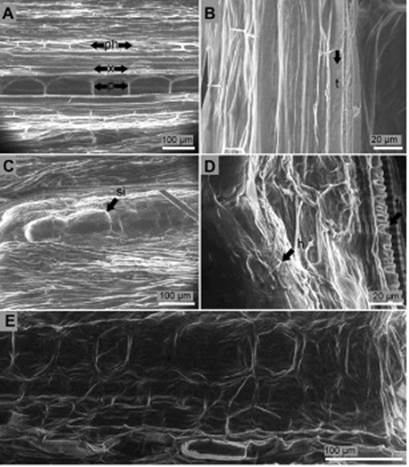Figure 4 Longitudinal section of the collar of P. edulis f. flavicarpa seedlings. (A, B) Non-inoculated seedling: p, pith; ph, phloem; x, xylem; t, tracheid. (C) Suggested inclusion (si) inside pith cells of the collar ten days after inoculation. (D) Hyphae (h) colonization of the inner tissues of the collar ten days after inoculation: t, tracheid. (E) Degraded cells and cell walls of the inner tissues of the collar ten days after inoculation.