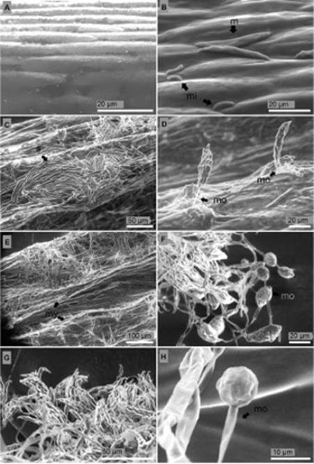 Surface of the leaves. Fusarium structures over the leaf surface came out from stomata six days after inoculation (Figure 7B). Leaf surface of non-inoculated seedlings were not overgrowth with mycelia of the fungus and stomata were free from any sign of the pathogen (Figure 7A, D). Thirteen days after inoculation monophialides appeared. Apical cell (false heads) of monophialides was joined to a relatively long conidiophore (74 μm length). Microconidia in situ were observed thirteen days after inoculation in leaf surface (Figure 7C) while macroconidia were not observed in these tissues. Deep colonization of leaf surface was carried out thirteen days after inoculation (Figure 7E).