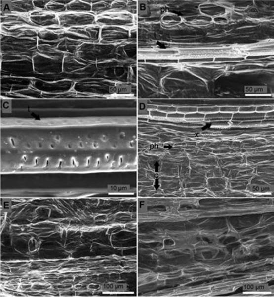 Figure 5 Longitudinal section of the stem of P. edulis f. flavicarpa seedlings. (A) Non-inoculated seedling. (B) Degraded vascular vessels 24 hours after inoculation: t, tracheid; ph, phloem. (C) Tracheid (t) with no signs of side-to-side hyphae colonization 24 h after inoculation. (D) Losses of turgor pressure of parenchymatous cells of the cortex four days after inoculation: c, cortex; ph, phloem; x, xylem. (E) Rot tissues five days after inoculation. (F) Rot tissues seven days after inoculation.